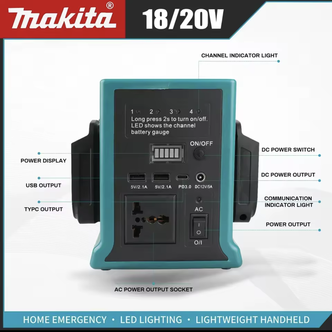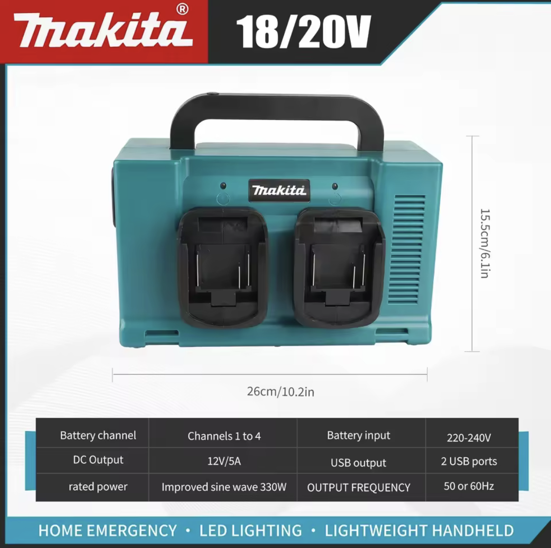 Makita 18/20V draagbare krachtcentrale: dubbele batterijsleuven, LED-verlichting, AC/DC/USB-uitgangen, lichtgewicht handheld voor noodgevallen thuis